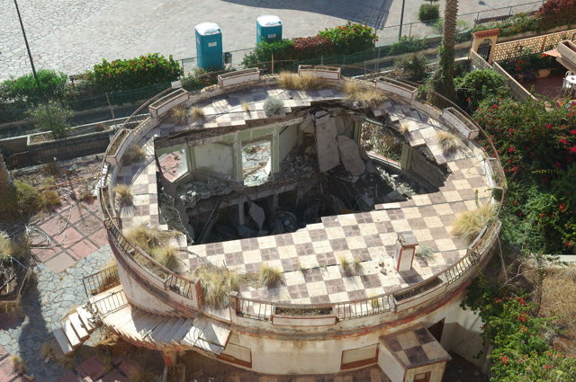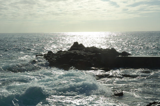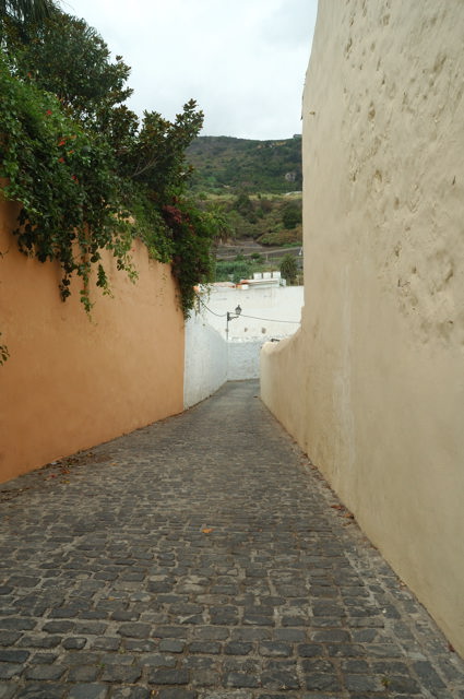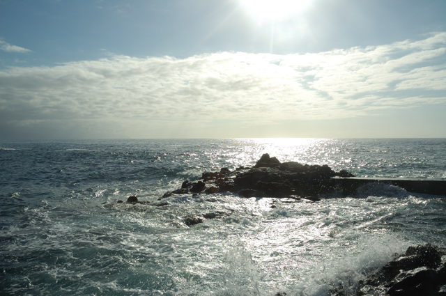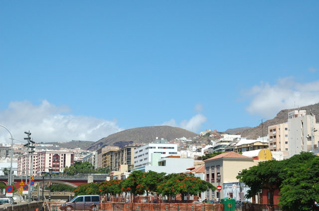 На обед мы присели в кафе за столиками на улице, и тут я впервые попробовала еще одно небезызвестное канарское блюдо курицу в чесночном соусе. Думаю, не совру, если скажу, что это было одно из вкуснейших блюд, которые мы пробовали здесь на острове. Я даже решила, что обязательно попробую сама такое приготовить (правда, уже почти год прошел, а я еще этого не сделала&). Ну правда, очень вкусно. Не знаю, как они так готовят эту курицу, но она одновременно и хрустящая, и нежная, и ароматная& Соус с чесноком просто язык можно проглотить& После обеда мы решили немного заняться шоппингом в «Эль Корте Инглес». Как всегда, долго кружили по окрестным улицам, чтобы найти способ подъехать к этому торговому центру, потому что из-за развернутых ремонтных работ это было не так-то просто& А после этого мы направились в сторону дома, решив, что обязательно по пути заедем на какой-нибудь пока не изведанный пляж. Сегодня выбор пал на пляж в Меса дель Мар. При помощи навигатора (который был не очень хорошо информирован об отсутствии некоторых дорог и присутствии других) мы все-таки спустились к океану по довольно живописному серпантину в Меса дель Мар. Там есть стоянка для машин прямо у набережной, но мы припарковались немного выше, так как заметили одно свободное место. Дальше спускались пешком. Сверху видно было вот что.
