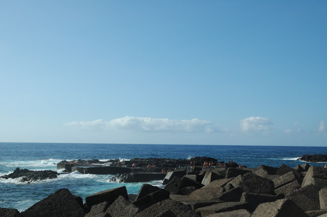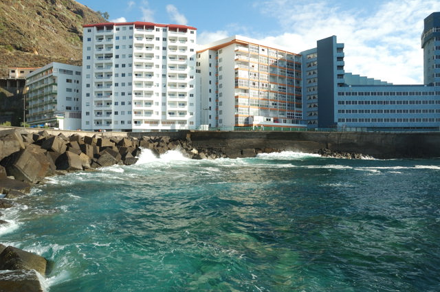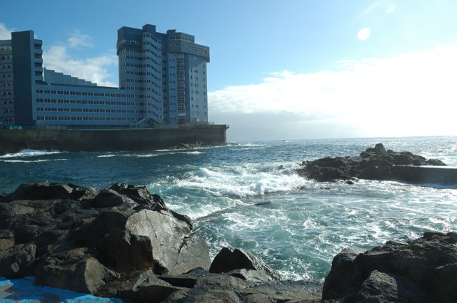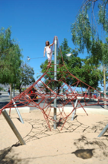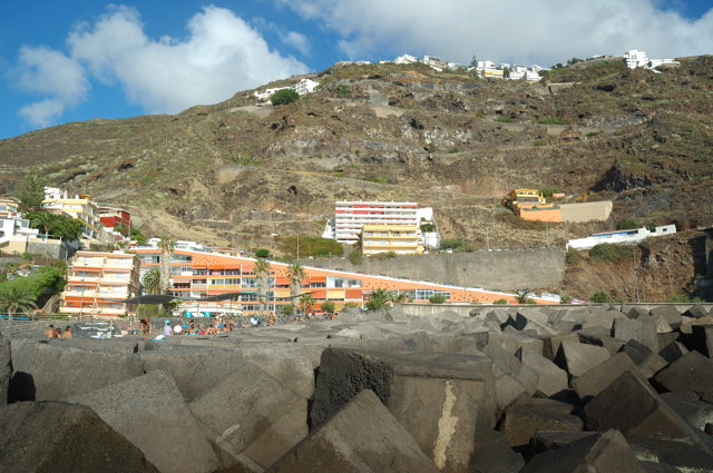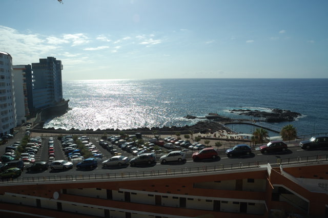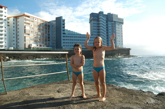 А тут видно большой бассейн, в котором тут все и купались с детьми. Остальные плавали рядом в океане, в который можно спускаться по лесенке с набережной. Часть набережной выстелена досками, можно довольно комфортно там расположиться.  Купаться (если без детей, которые не умеют плавать) лучше в океане, а не в бассейне рядом. Бассейн этот какой-то странный& Он просто забетонирован, т.е. дно в нем довольно грубое, совсем не гладкое, с камушками. Вода очень грязная, особенно с одной стороны. У нашей Нины еще перед поездкой был план-максимум на Тенерифе научиться плавать. Так вот к этому моменту плавать она уже умела и довольно сносно. Так что купание у нас заключалось в том, что она прыгала прямо с набережной в воду в океан, а я там покачивалась на волнах поблизости в качестве страховки.