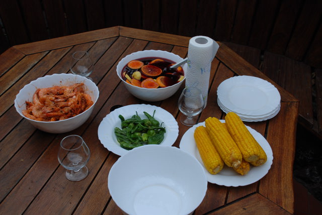 В целом, это место нам не очень приглянулось. Но все равно было интересно проехать по достаточно крутому серпантину и очень-очень приятно после целого жаркого дня в городе окунуться в прохладную чистую воду Атлантики& А это наш сегодняшний простой, незатейливый ужин&  Креветки, «Сангрия» собственного приготовления, вареная кукуруза и перчики. Это блюдо из маленьких зеленых перчиков Пимьенто де Падрон я как-то заметила на соседнем столике в каком-то ресторане. Мне очень понравился его вид, а потом, увидев эти перчики в магазине в отделе овощей, я решила попробовать соорудить что-то подобное: вымытые перчики целиком, прямо с плодоножками, положила в тарелку, сбрызнула немного маслом, солью и черным перцем и на несколько минут сунула в микроволновку. Получилось как раз то, что надо! Прекрасная закуска. Мы это блюдо заказывали потом везде в ресторанчиках и постоянно делали дома сами. Очень вкусно! День 54-й. 12 августа. Сегодня мы с Ниной отвезли Полину с ее родителями на пляж Лас Аренас (что недалеко от Буэнависты дель Норте), а сами просто бездельничали целый день (как раз примерно с этого дня у меня начало понемногу ухудшаться самочувствие, вследствие чего через неделю я окажусь в больнице, так что в эти несколько дней я буду много «сачковать» и никуда не ездить)...