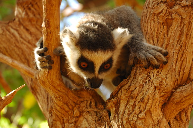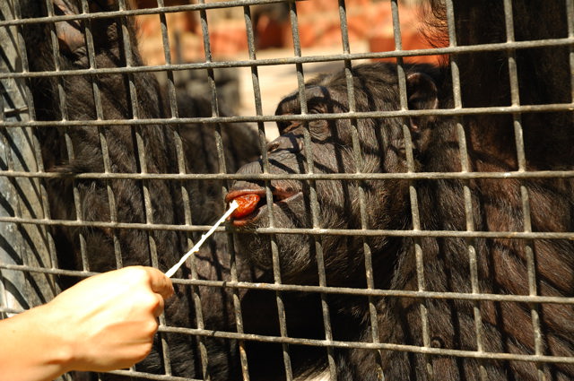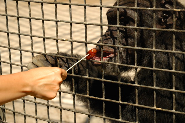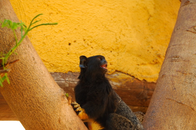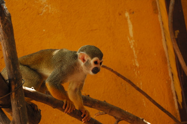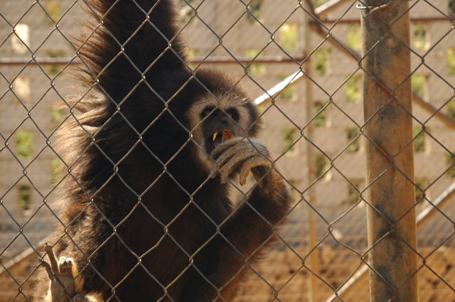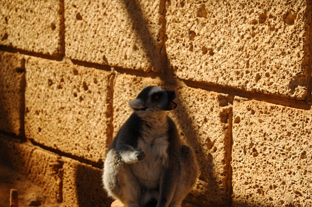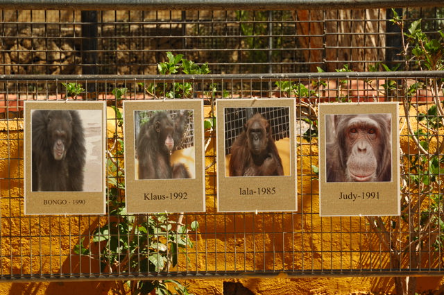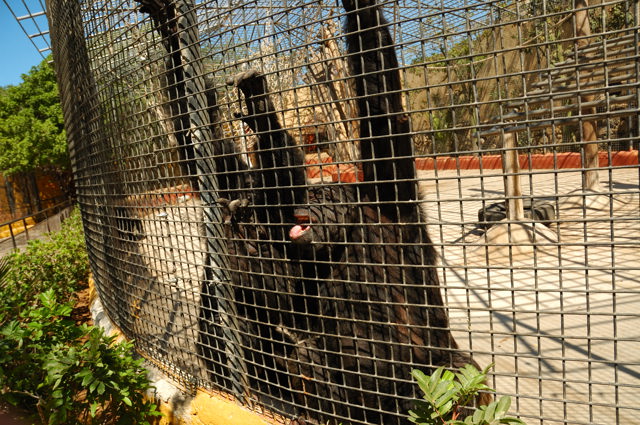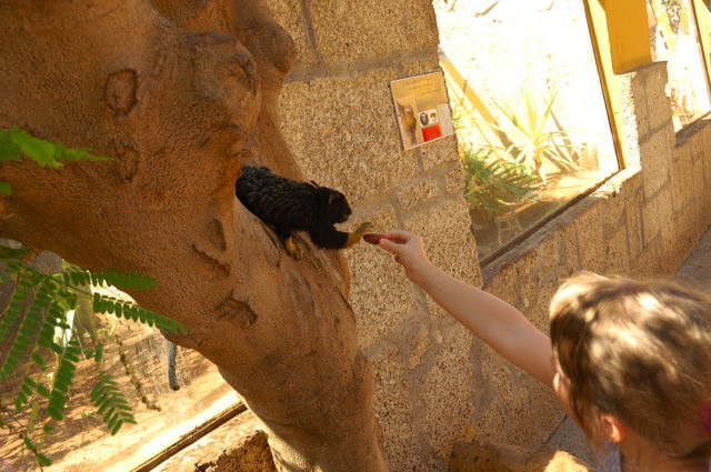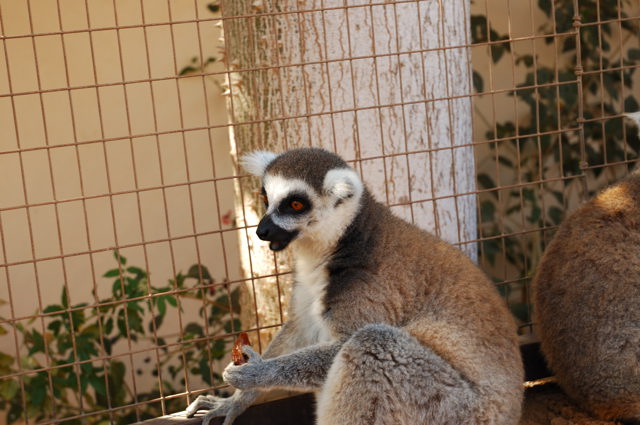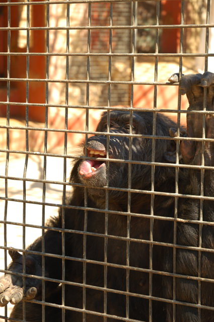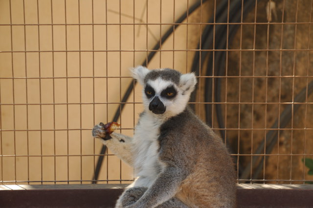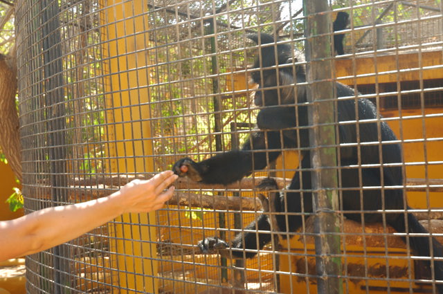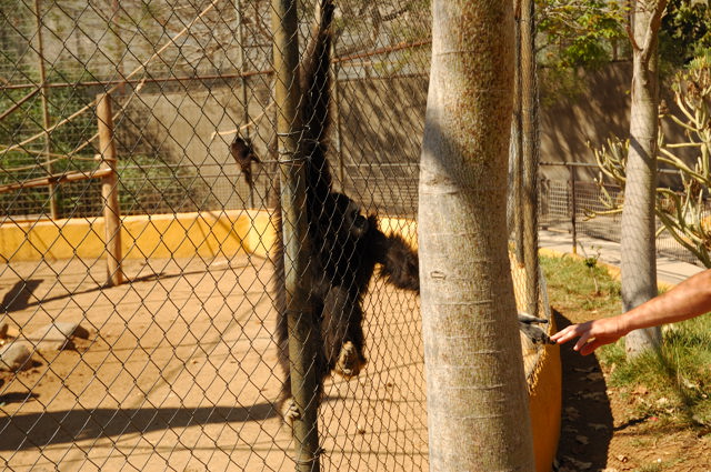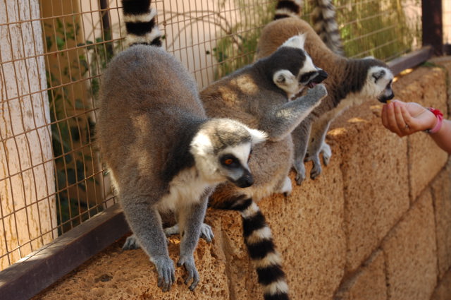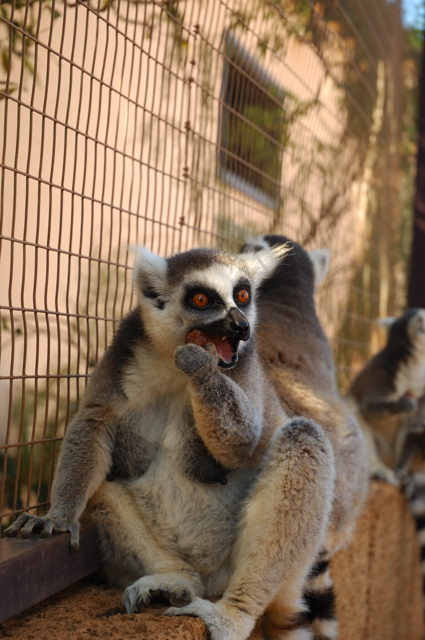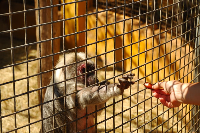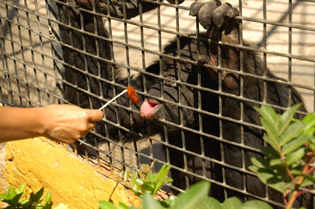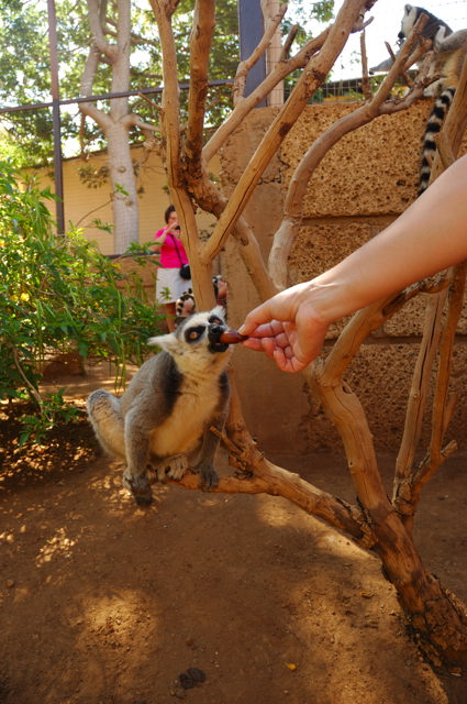 А эти какие хорошенькие!   Потом мы пошли покормить и остальных обитателей зоопарка, тем более что лемуры уже, видимо, наелись и не очень обращали на нас внимание. Другие обезьяны тоже все очень забавные, все очень разные, и с виду, и по поведению. Во многих вольерах, когда протягиваешь кому-то финик, сразу становится очевидной иерархия отношений: понимаешь, кто тут главный&   До многих клеток дотянуться трудновато, но все-таки возможно. Настоящее представление нам устроили шимпанзе. Этот товарищ, получив финик, с нахальным видом громко хлопнул в ладоши над головой и вытянул лапу и еще губу через прутья клетки, давай, мол, еще фиников сюда!