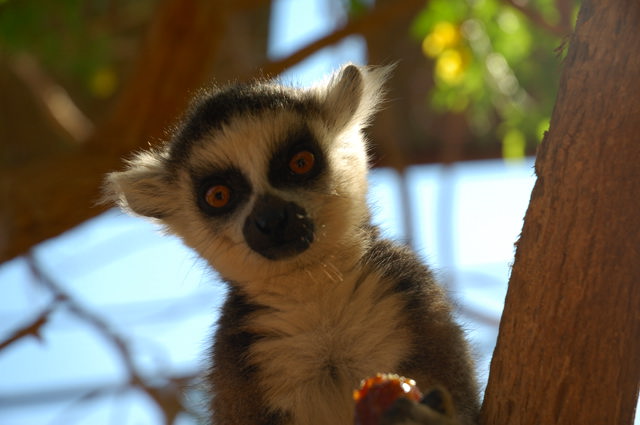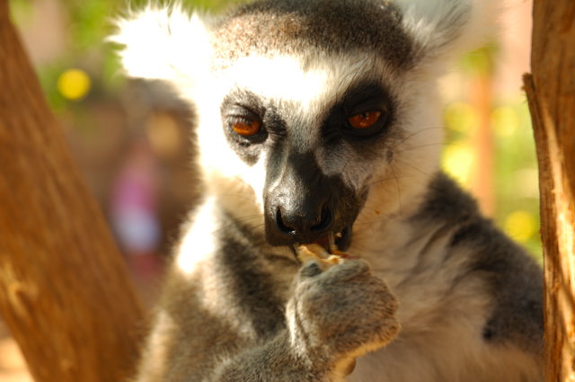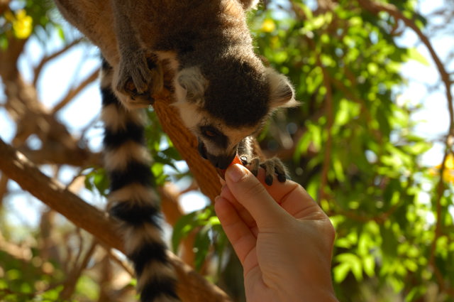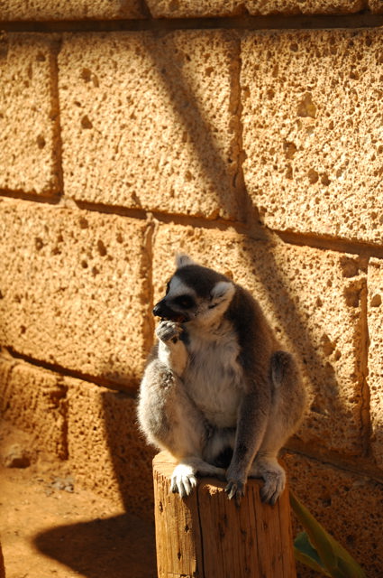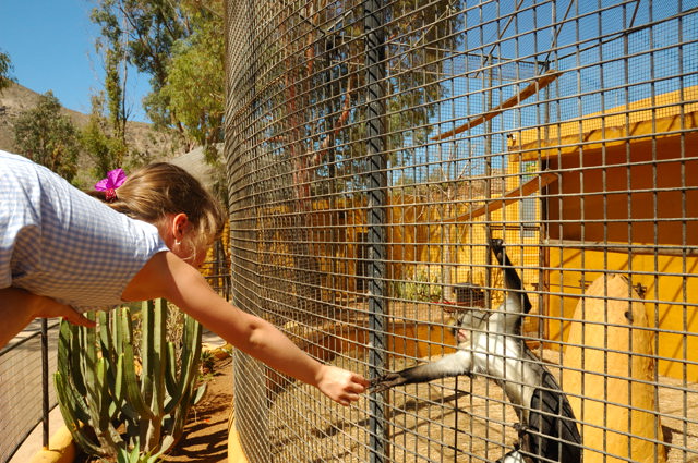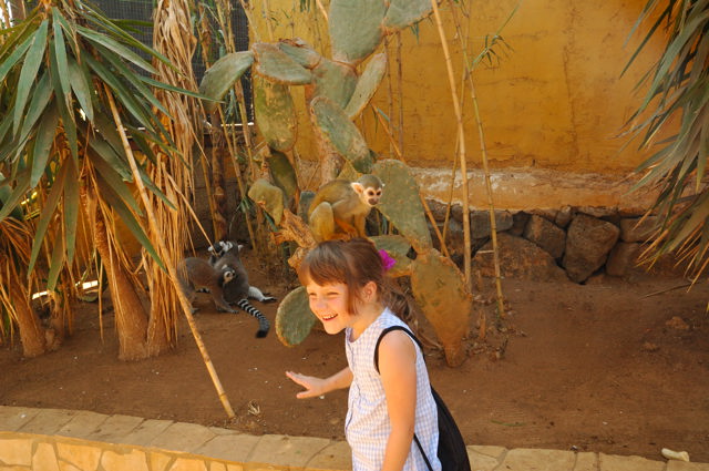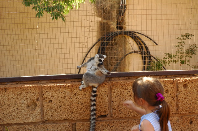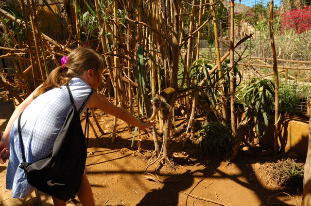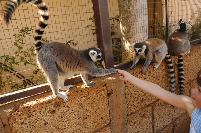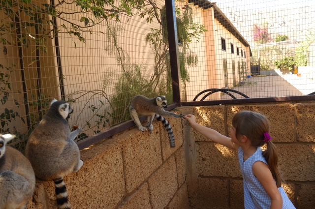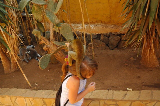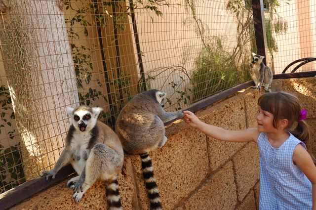 День 10-й. 29 июня. Рано утречком мы решили поехать в Манки Парк. Этой поездки я ждала с особенным чувством. Подошла к ней ответственно, сказав всей семье, что мы туда едем только с финиками!!! По пути мы остановились у магазина в Гия де Исора и закупились немалым количеством этих самых фруктов. Хотелось в Манки Парк приехать к самому открытию, чтобы зверюшки больше радовались нашим подношениям, но мы немного припозднились и приехали туда уже после 10 часов (а парк открывается в 9.30). У входа я с удивлением заметила надпись, что, оказывается, животных тут кормить нельзя! Мол, можно только тот сухой корм покупать (чего мы, конечно, делать не стали). Успешно пройдя мимо попугаев (сфотографироваться, конечно, все равно пришлось), мы сразу перешли к делу. Народу в парке уже было довольно много, особенно около лемуров, конечно. Много было и русских, но, судя по тому, что с финиками были только мы, все они форума, наверное, не читали&  И тут мы почувствовали свое мощное преимущество! Маленькие обезьянки и лемуры сразу заметили, у кого тут правильная еда, и стали бросать кусочки бананов и сухарей, которыми их уже угостили другие, на землю, чтобы лапки были свободны для фиников.  Вокруг нас «иностранцы» зашептались: «Финики, финики&» Так и они узнали, с каким угощением нужно являться к лемурам!