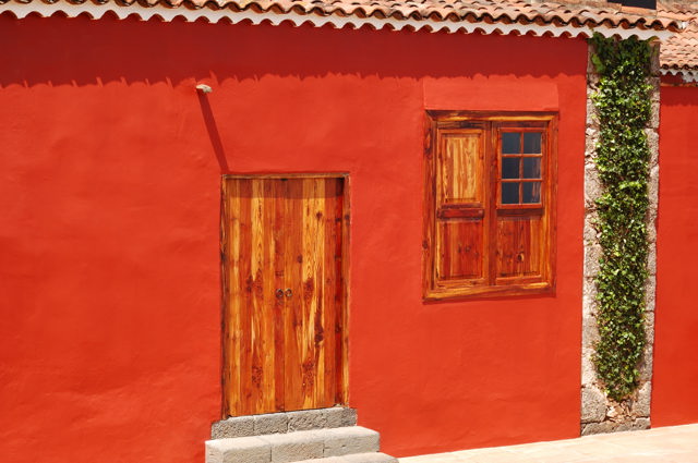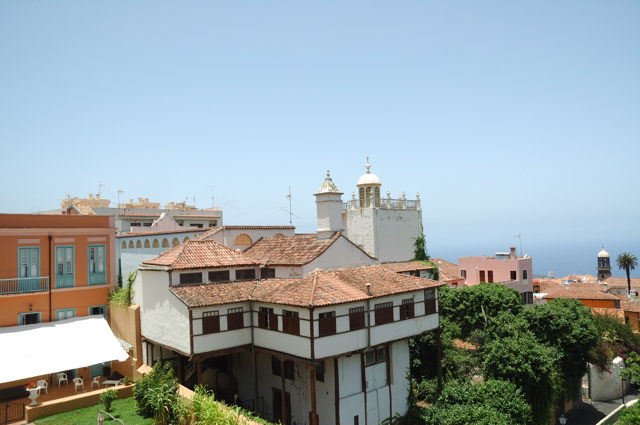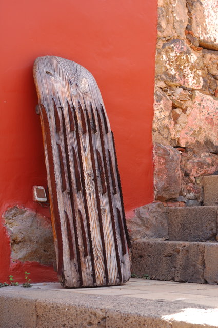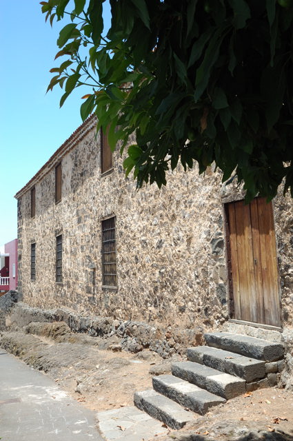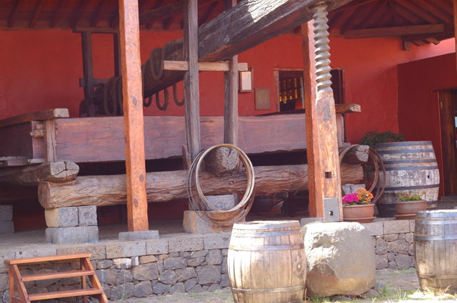 День 22-й. 11 июля. Сегодня продвигаемся по северу дальше на восток, туда, где еще не были: Эль Саусал, Такоронте... Первым делом хочется заехать в Музей (а точнее музейчик) вина и меда. Мы едем из дома мимо Пуэрто по TF5 до съезда на Эль Саусал. Когда съезжаешь с шоссе, сразу замечаешь указатель на этот музей: Casa del Vino La Baranda. Мы поехали в ту сторону, как было указано, но сам музей все-таки чуть-чуть проскочили. Он справа, и прямо мимо него направо же ведет улочка, по которой мы стали спускаться. Этого не надо было делать. Надо было просто сразу встать на стоянке напротив музея, она довольно заметная. Вернулись, поставили там машину. Вход в музей бесплатный. Музей состоит из двух частей одна про вино, другая про мед.  Про вино на стендах про все написано не только по-испански, но и по-английски, даже довольно интересно. Есть всякие старинные экспонаты, бочки, прессы& Вообще, даже сама атмосфера приятная очень: типичный канарский дом, красивого яркого цвета, вокруг много загадочных предметов& Когда входишь в музей, работница интересуется, какой язык предпочитаете, и тогда проводит в первое помещение с удивительной красоты резным деревянным потолком. Кажется, он был вырезан в 17-ом веке и, наверное, является одной из главных достопримечательностей этого здания.   Дальше просто свободно гуляешь по территории музея, читаешь, смотришь&   Эта витрина впечатляет& В ней выставлены все вина, производимые на Тенерифе!