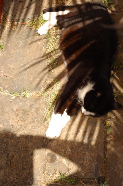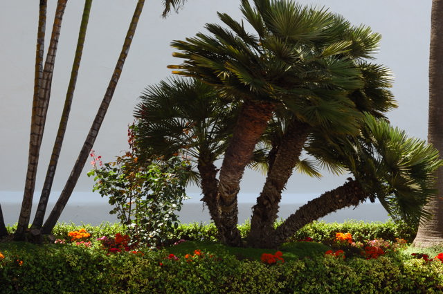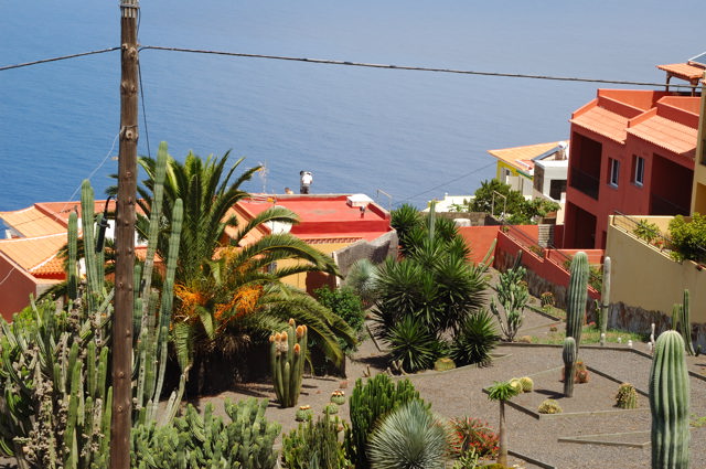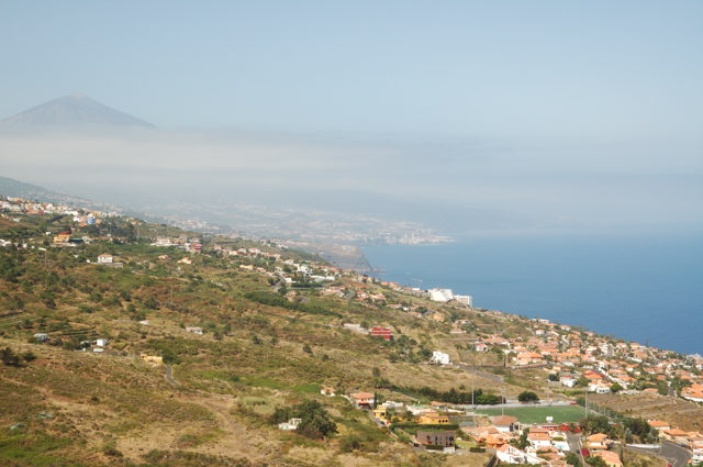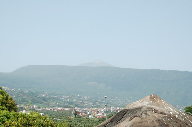 Те, кто тут живет, могут сказать: «А из нашего окна (то есть из двери)& Виден Тейде!»  Хорошо спать под тенью пальмы& Наверное, это его мисочки с едой и водой стоят прямо во дворике музея у винного пресса.  Часть музея про мед мне понравилась меньше. Она такая вся «хай-течная»& И оформление, и представленные технологии изготовления меда. Казалось бы, должны быть выставлены какие-то старинные ульи или еще что-то в этом роде, но нет. Вместо этого показаны какие-то лабораторные методы производства меда, за стеклом в алюминиевых «космических» стендах& Дочке зато понравилось: там есть стенд с картой Тенерифе и разные кнопки, при нажатии на которые разные части острова высвечиваются, показывая, где какой мед делают. И еще в этой части музея исключительно все написано по-испански. Ничего не понятно& Еще на территории музея есть ресторан (который по некоторым отзывам хороший) и магазин, где можно приобрести разное вино, мед, конечно, и другие вещи, присутствующие обычно и в других магазинах для туристов. Мы в ресторане не ели, в магазине ничего не купили& В нашем путеводителе по Тенерифе про Эль Саусал написано, что отсюда открываются одни из лучших видов на Тейде. Я полностью могу согласиться, только еще бы добавила, что не только виды на Тейде, но и вообще прекрасные виды, одни из лучших пока виденных мною на острове. Сегодня очень ясная, жаркая погода, все побережье как на ладони& Ну и Тейде, разумеется, красавец!