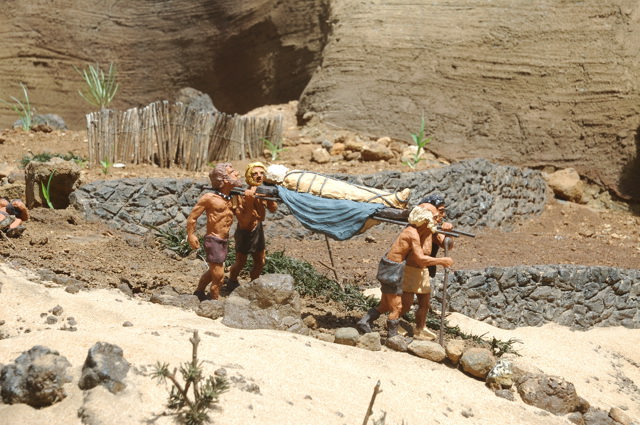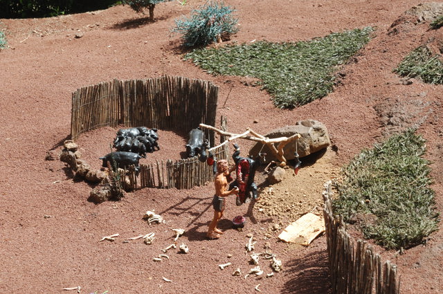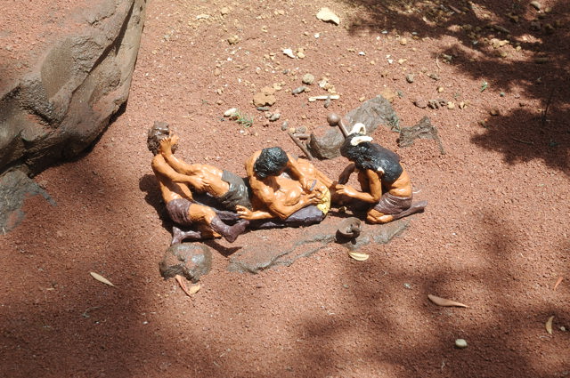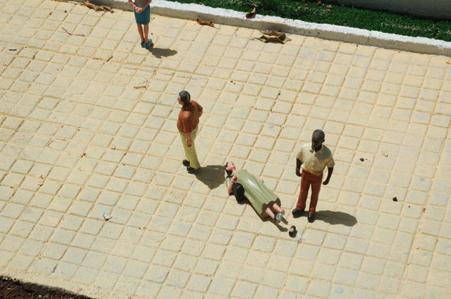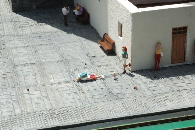 Глядя на эту композицию, мы гадали, что же они там делают? Зуб удаляют этому несчастному? Какие еще у кого будут идеи?  Натуралистично до невозможности&   Ящерица у колодца живая, конечно.  Они вообще, наверное, себя чувствуют хозяевами мира в этом мирке.  Один турист, значит, упал, потому что у него отломалась нога, а его подруга, не меняя двусмысленной позы, спокойно продолжает стоять&