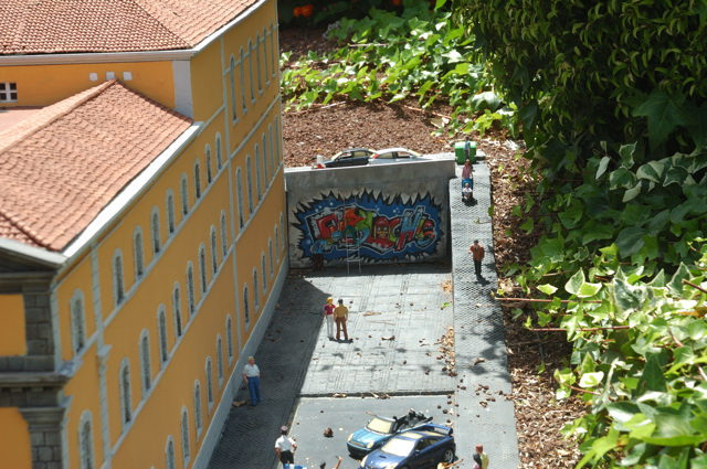 Даже граффити на стене&  В Пуэблочико можно не только экспонатами полюбоваться& Эти цветочки замечательно пахнут&  Эта девушка не только живет на Тенерифе (в этом раю!), но и на жизнь себе зарабатывает в атмосфере детского праздника раскрашивая каменные плитки миниатюрного Кастильо Сан Мигель&  На этот раз нога отломалась у женщины (кажется, еще и беременной), а ее мужчина остается полностью равнодушным. А другой так и вовсе демонстративно отвернулся!  Ненастоящий Тейде на фоне настоящего. Полный сюр!  Даже белье на крыше сохнет&  В общем, этот парк хорошее развлечение при соответствующем настрое. Правда, забавно, можно многое заметить, что с первого взгляда как будто и не видно& С другой стороны, если времени у Вас не очень много, то вряд ли его стоит тратить на поездку сюда. Это так, если мимо проезжали&