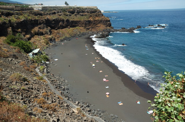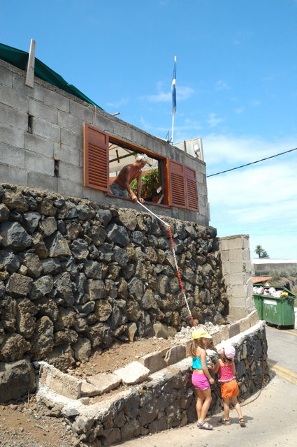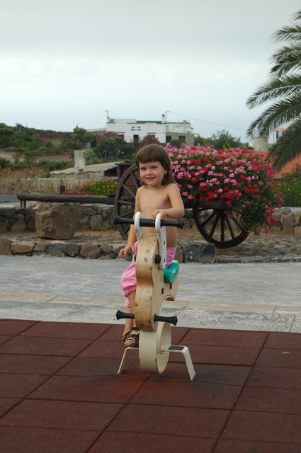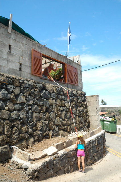 День 46-й. 4 августа. Сегодня мы едем на пляж Боллулло. Дорога мне уже известна, да и, признаюсь, мне хочется этой дорогой попугать родителей.  Все-таки она на каждом повороте и даже на прямых участках позволяет испытать острые ощущения. И пляж мне нравится. По пути, где-то между Икодом и Пуэрто видим на шоссе аварию, да еще такую, после которой мальчика-подростка укладывали на носилки с зафиксированным позвоночником и шеей& Пишу про это потому, что как-то не задумываешься о таких вещах, когда находишься в таком чудесном месте, как Тенерифе. Кажется, что и забот-то не может быть никаких, кроме того, в каком ресторане поужинать и на каком пляже купаться& В общем, стало очень жаль этих людей, которые, приехав в отпуск, попали в такое жуткое положение& На пляже была яркая, солнечная погода, просто блеск! Вот пара кадров, как там надо платить за стоянку (я уже писала, что спускают ведерко, в которое надо положить деньги, а потом обратно в нем же спускают сдачу  ). Для наших детей это уже само по себе было забавным аттракционом.