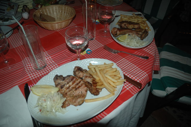 День 49-й. 7 августа. Сегодня последний день «второй смены». Завтра утром едем в аэропорт проводить родителей и встретить мою сестру с мужем (родителей Полины). Поэтому сегодня, конечно, тем, кто завтра уезжает, надо вдоволь накупаться и назагораться. Для этого мы подались на юг и наугад попали на пляж Троя. Целый день так и прошел: лениво загорали, купались, ели мороженое и фаст-фуд из ближайшего «МакДональдс». Там со мной произошла смешная история, о которой я уже где-то писала: мне пришлось поработать переводчиком для русского парня, который не мог объяснить, что он хочет заказать. А заказать он хотел один из комплексов и пытался объяснить стоящей за прилавком испанке на чистом русском языке, громко и членораздельно, что он хочет «КАР-ТОШ-КУ!». Выглядело со стороны очень забавно.  На пляже мы все очень хорошо провели время, ну оно и понятно... Вечером у нас праздничный ужин по случаю завтрашнего отъезда родителей, а еще по поводу десятилетней годовщины нашей свадьбы (только очень грустно, что такую круглую дату семейной жизни мы с мужем вынуждены отметить в тысячах километров друг от друга&). В «Эль Монастерио». Теперь я не понимаю, почему, но к этому моменту, пробыв на Тенерифе 7 недель, мы так ни разу там и не были& Зато после этого вечера нам так тут понравилось!!! за оставшиеся две недели мы еще раз шесть сюда приедем, в разное время: и позавтракать, и пообедать, и поужинать& И все эти шесть-семь раз мы выбирали ресторан «Комедор Принсипаль» (в «Эль Монастерио» несколько ресторанов), а точнее его террасу, просторную, очень уютную, с красно-белыми клетчатыми скатертями. Все тут красиво, приятно, необыкновенно& И окружение, и меню, и продукты собственного изготовления (хлеб, банановый хлеб, собственно бананы, пиво&), и обслуживание&