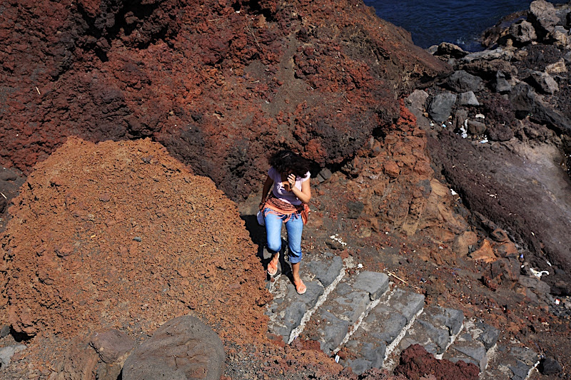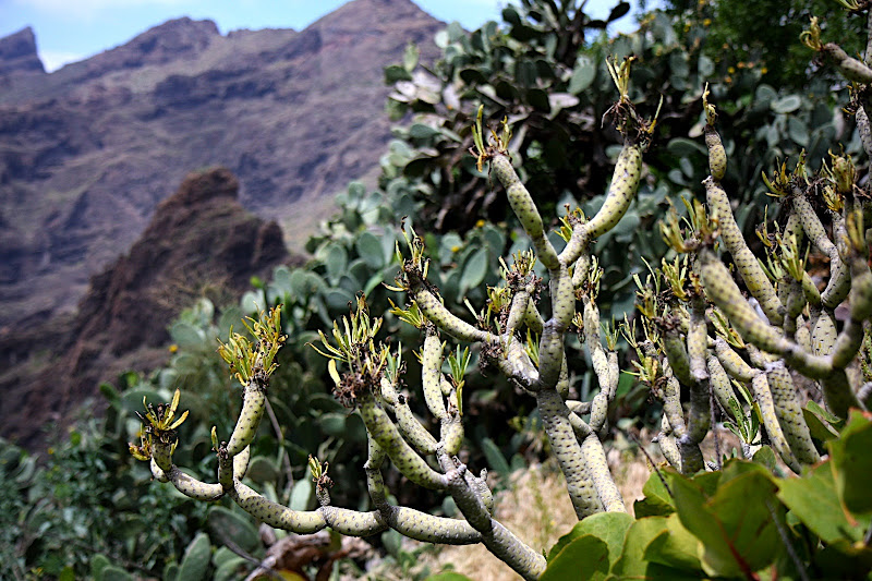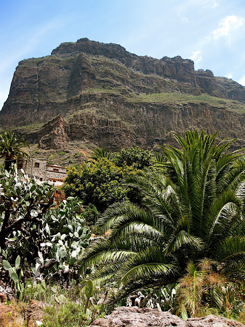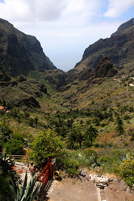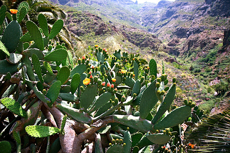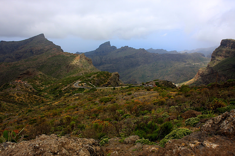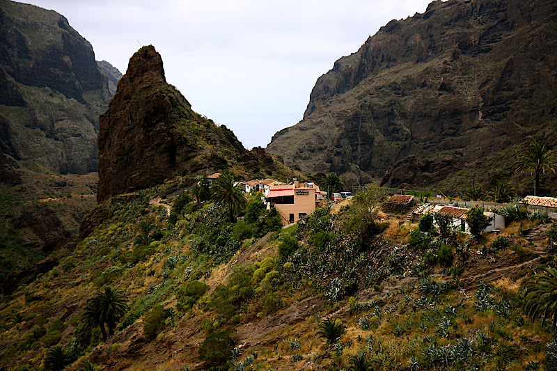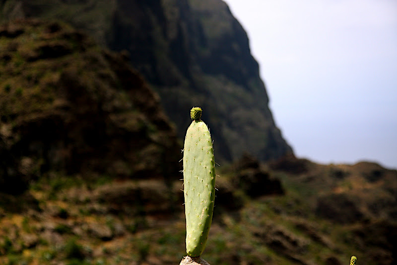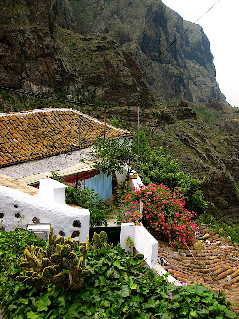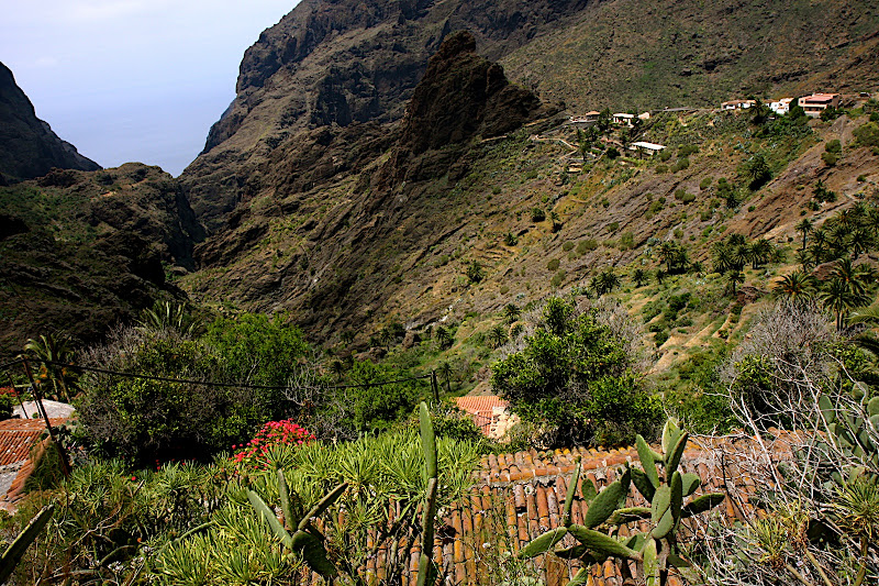 Припарковали машину, нарезав несколько кругов, и пошли гулять. Очень живописное место - разноцветные горы, до которых хочется дотянуться и потрогать, кусочек океана в V-образном вырезе скалистого ущелья, а напротив на горе буквально висит деревня, вся в пальмах, раскидистых, умопомрачительных кактусах (некоторые коварные) и шипучем шорохе ящериц. Все вымощенные крутые тропинки заканчиваются тупиком, а за ним обрыв. Хочется пройти по каждой, дойти до конца, и еще раз окинуть взором панораму ущелья воплощение волшебной красоты, магического притяжения, восхищения и вместе с тем звенящей тишины, спокойствия, уюта&