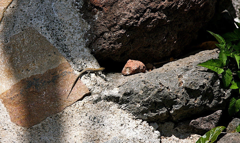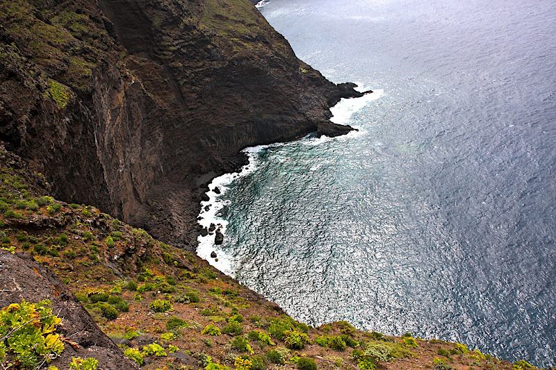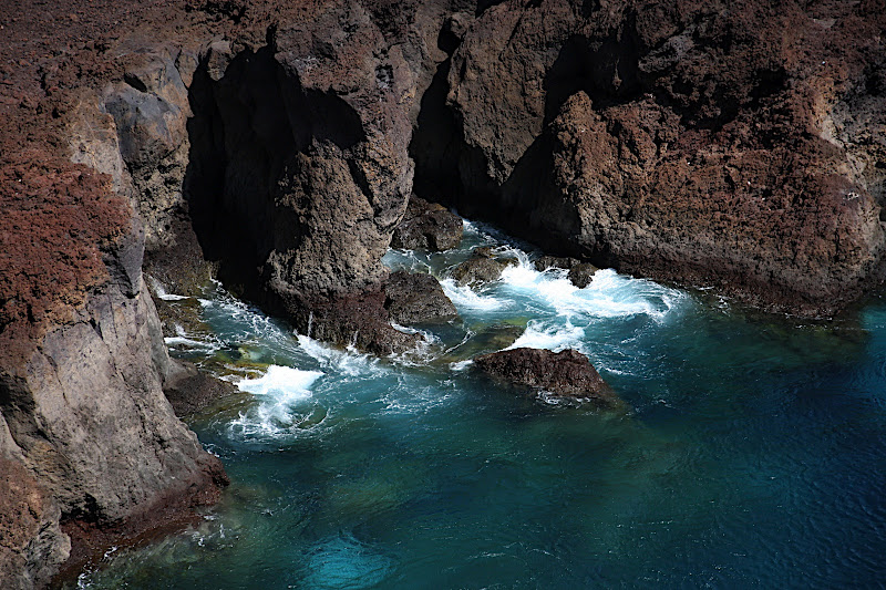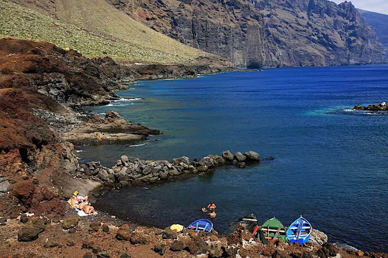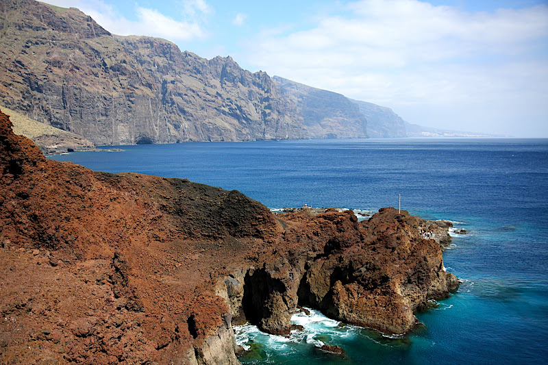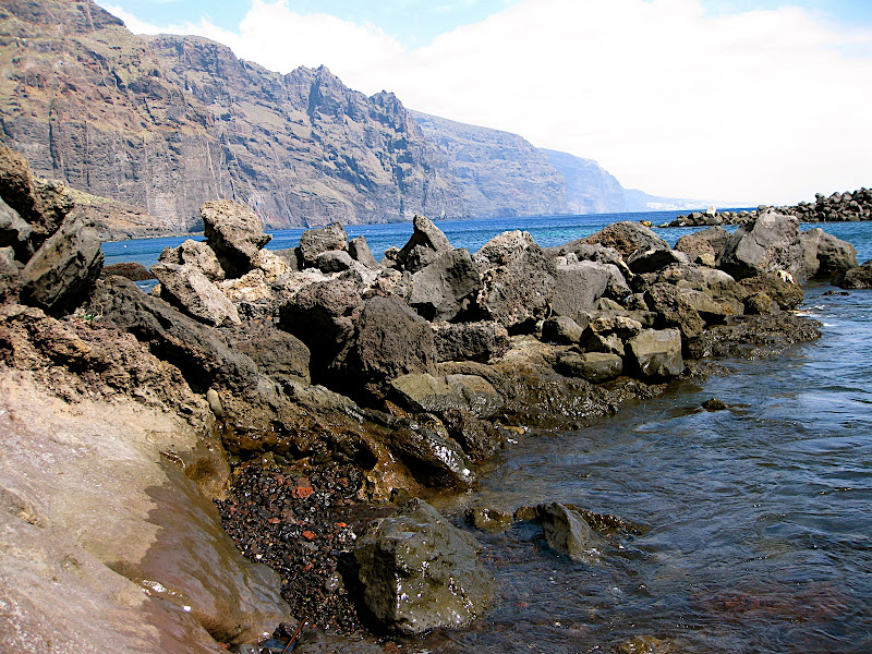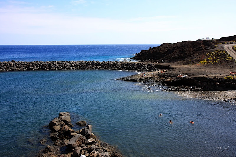 И мы проехали этот, не побоюсь этого слова, опасный участок дороги. И не пожалели! Не мы одни сюда приехали, порядка 15 машин стояло вокруг. Было очень жарко и очень ветрено, особенно около маяка. Мыс окружен красивым скалистым берегом, по которому разбросаны маленькие цветочные кустики, кристально прозрачной синей, спокойной водой. Здесь также гармонично сочетаются типичные тенерифские краски: синий, краснокирпичный, белый, желтый. В заводях маленькие пляжики-бассейны. Один находится в низине, там ветра нет совсем. Туда мы и поспешили. Очень хотелось купаться. Мест на песочке не было, там отдыхали местные, причем с маленькими детьми. Мы расположились на камнях, нам не привыкать. И купались, купались. Полный штиль, в воде прохладно но так клево!!!