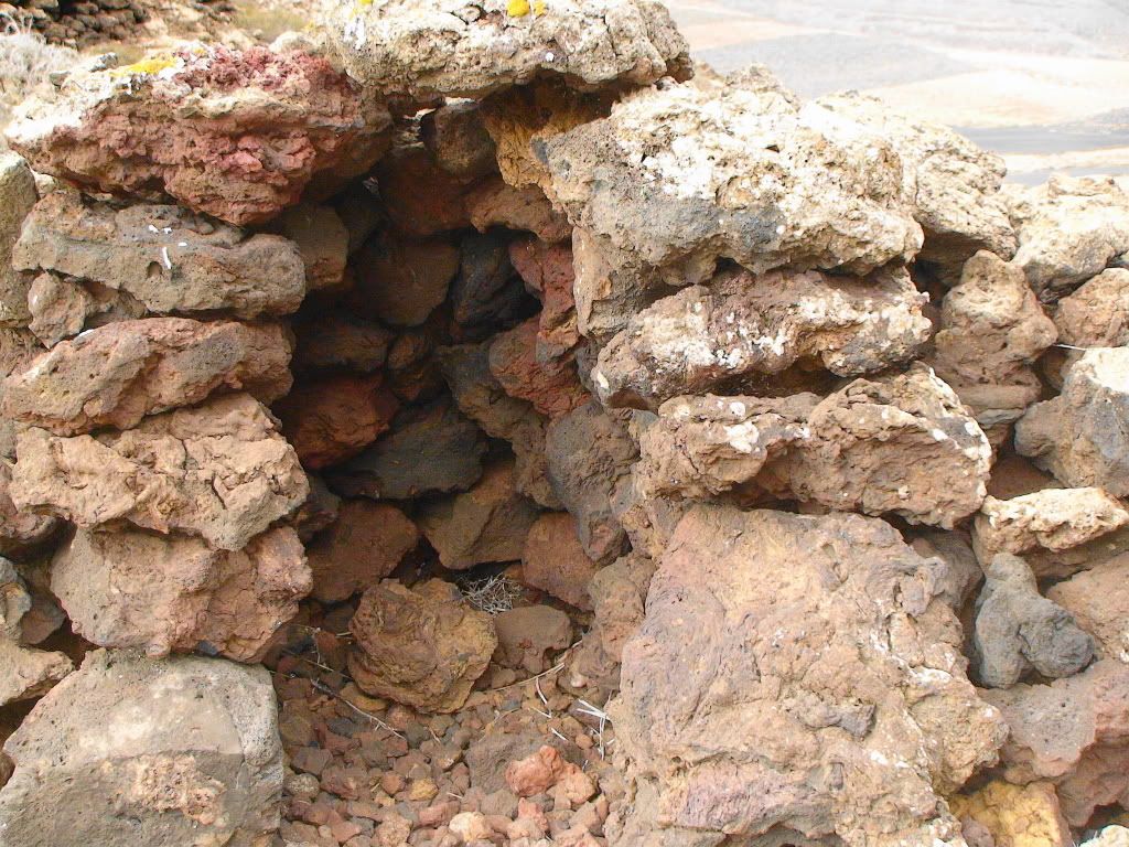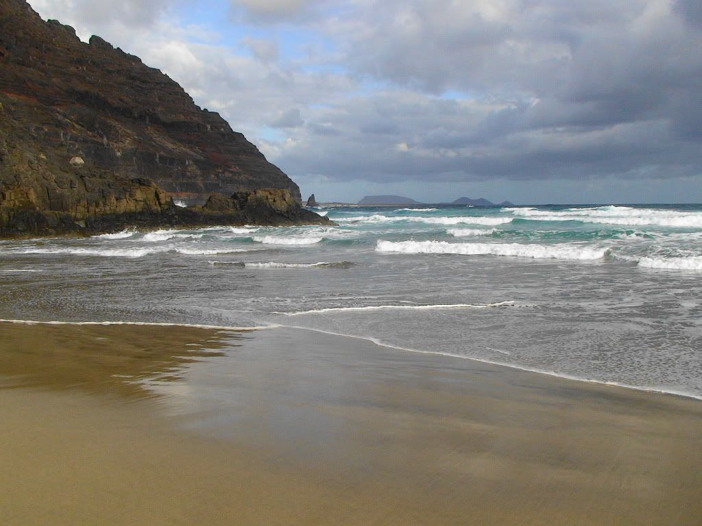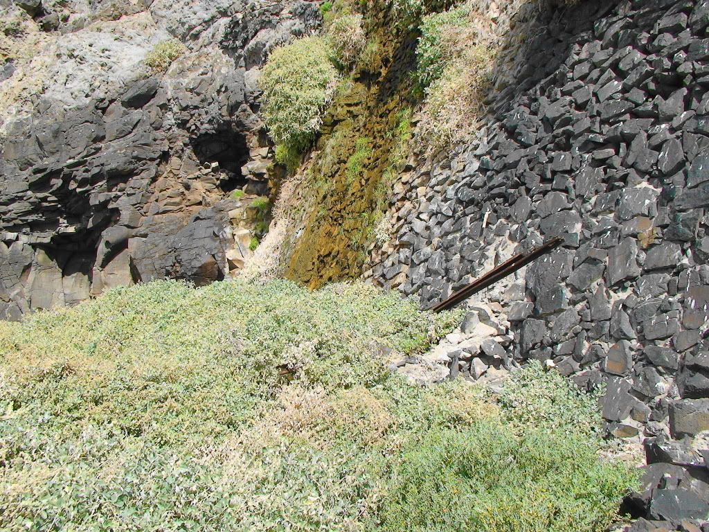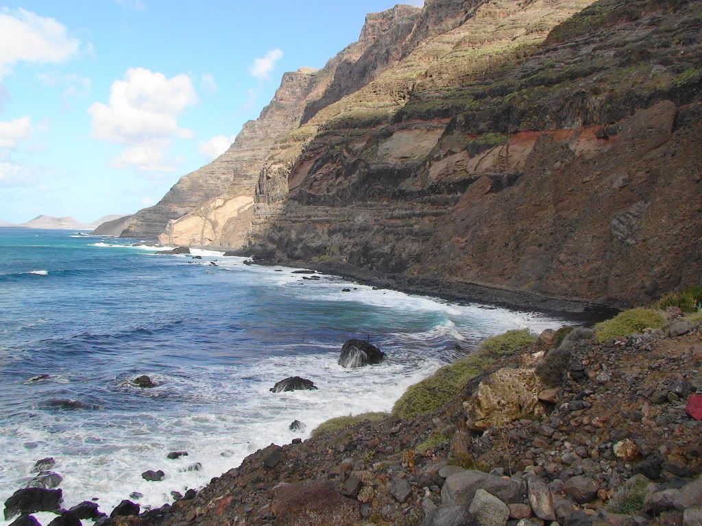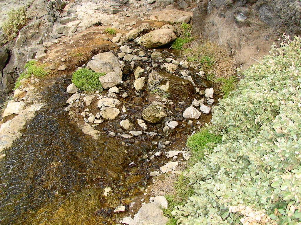 La Galeria de FamaraГалереи, или подземные водные туннели Лансароте. Они были построены около 100 лет назад и служили для сбора пресной воды и обеспечения ею жителей близлежащих посёлков. Два туннеля находятся в скальном массиве Risco de Famara, два в районе Valle de Temisa (Chafariz). После постройки завода по опреснению галереи более не используются по прямому назначению, хотя вода по-прежнему собирается, скапливается и...вытекает в океан. Даже в самое засушливое лето поток воды полностью не иссякает. Скальный массив Risco de Famara является самым высоким и самым старым на острове, протяжённость скал около 15 километров. Здесь же находится самая высокая гора Лансароте - Penas del Chache (672 метра). Проникая в почву в виде дождей и частично конденсируясь из облаков, вода проходит сквозь проницаемый слой земли и частично минерализуется. Туннели прорублены в труднопроницаемых для воды скальных породах в виде вертикальных и горизонтальных шахт с отводами и резервуарами для сбора. Длина каждого из туннелей несколько сотен метров (общая более 3 км.), ширина/высота в среднем от метра до 2,5. Судя по информации в интернете, в туннели можно попасть посредством платной экскурсии с гидом в группе. Лично я бы этого делать не стал, поскольку внутреннее состояние туннелей у меня вызывает определённые опасения и кроме того, мы видели следы обрушения на выходящих наружу участках. Путь к туннелям начинается с пляжа Фамары по широкой грунтовке, уходящей к скалам, тут ещё можно проехать на авто. Далее пешком дорога наверх в горку, извилистые каменисто-галечные тропинки в скалах, для прохода по которым требуется определённая концентрация, собранность и надёжная обувь.  Спускаемся к пляжу по уходящей резко вниз тропе, страхуя себя веревкой, кем-то заботливо зацепленной за камень.  Пляж каменистный, с большими валунами и приличным участком, полностью заваленным водорослями, выбрасываемыми океаном во время прилива. Глубина их слоя здесь достигает 20-30 сантиметров и приходится идти вплотную к скалам, проваливаясь минимум по щиколотку.