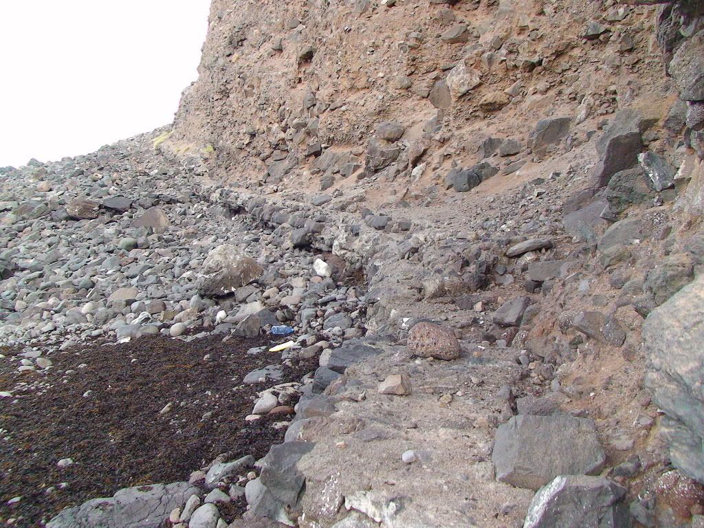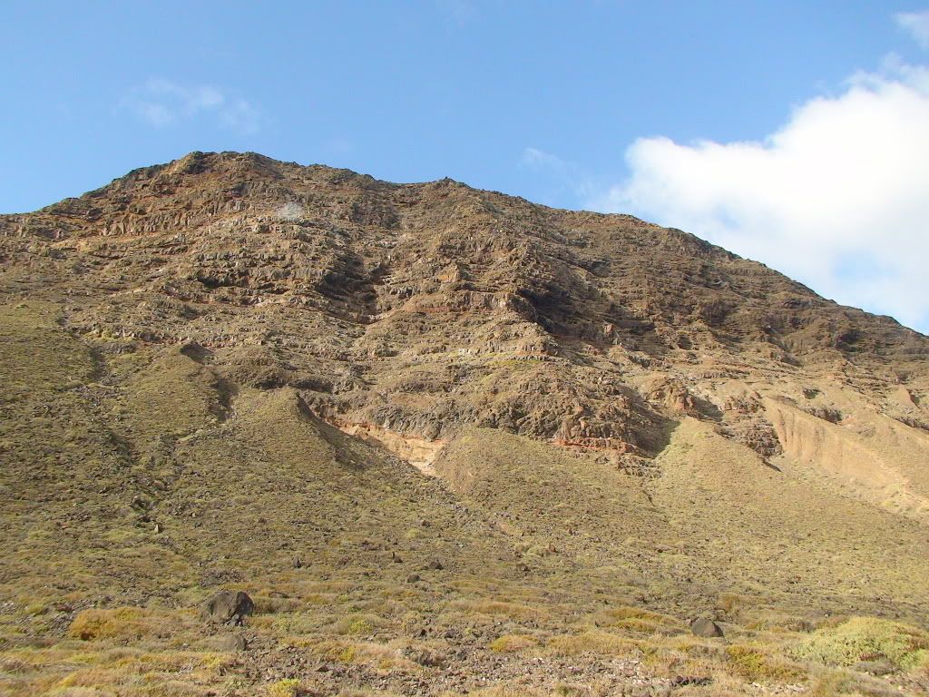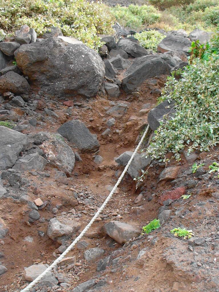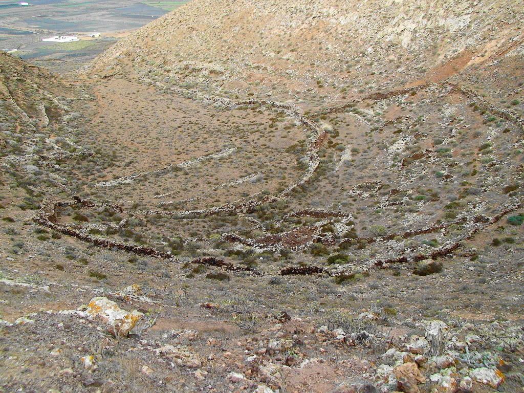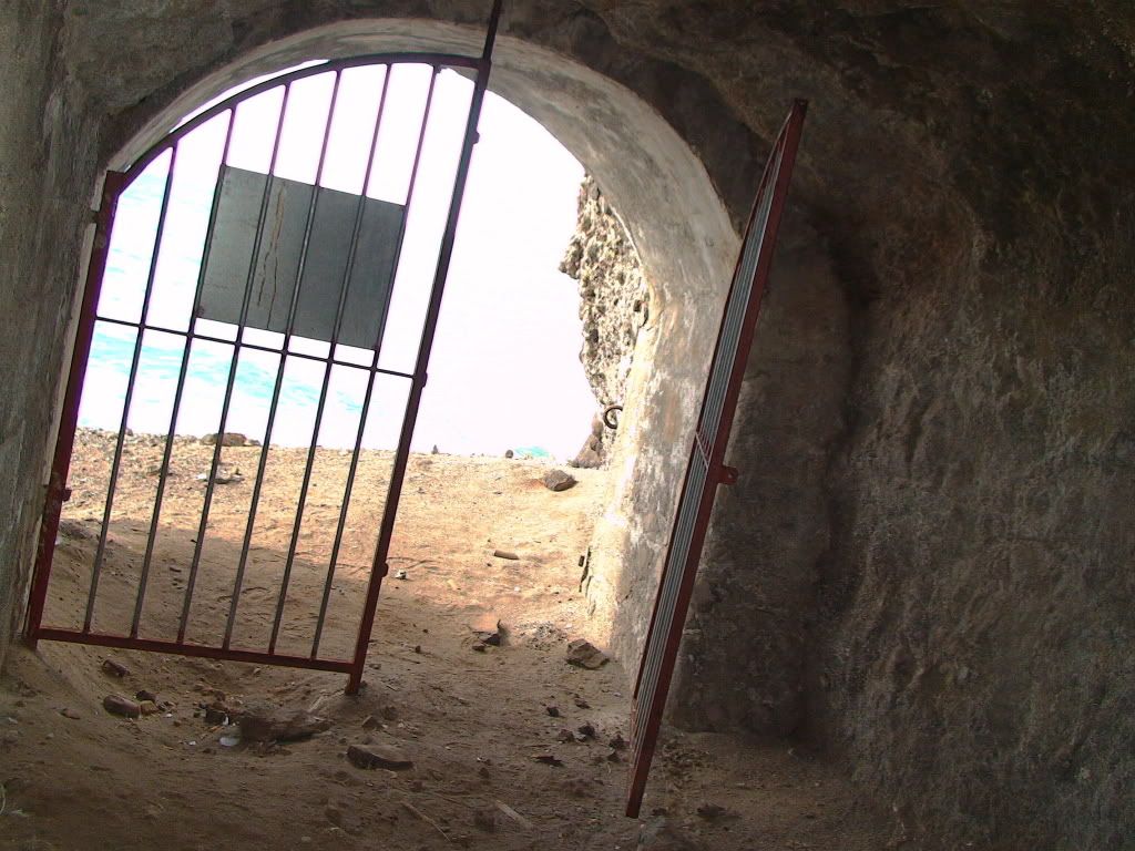La Galeria de FamaraГалереи, или подземные водные туннели Лансароте. Они были построены около 100 лет назад и служили для сбора пресной воды и обеспечения ею жителей близлежащих посёлков. Два туннеля находятся в скальном массиве Risco de Famara, два в районе Valle de Temisa (Chafariz). После постройки завода по опреснению галереи более не используются по прямому назначению, хотя вода по-прежнему собирается, скапливается и...вытекает в океан. Даже в самое засушливое лето поток воды полностью не иссякает. Скальный массив Risco de Famara является самым высоким и самым старым на острове, протяжённость скал около 15 километров. Здесь же находится самая высокая гора Лансароте - Penas del Chache (672 метра). Проникая в почву в виде дождей и частично конденсируясь из облаков, вода проходит сквозь проницаемый слой земли и частично минерализуется. Туннели прорублены в труднопроницаемых для воды скальных породах в виде вертикальных и горизонтальных шахт с отводами и резервуарами для сбора. Длина каждого из туннелей несколько сотен метров (общая более 3 км.), ширина/высота в среднем от метра до 2,5. Судя по информации в интернете, в туннели можно попасть посредством платной экскурсии с гидом в группе. Лично я бы этого делать не стал, поскольку внутреннее состояние туннелей у меня вызывает определённые опасения и кроме того, мы видели следы обрушения на выходящих наружу участках. Путь к туннелям начинается с пляжа Фамары по широкой грунтовке, уходящей к скалам, тут ещё можно проехать на авто. Далее пешком дорога наверх в горку, извилистые каменисто-галечные тропинки в скалах, для прохода по которым требуется определённая концентрация, собранность и надёжная обувь.  Спускаемся к пляжу по уходящей резко вниз тропе, страхуя себя веревкой, кем-то заботливо зацепленной за камень.  Пляж каменистный, с большими валунами и приличным участком, полностью заваленным водорослями, выбрасываемыми океаном во время прилива. Глубина их слоя здесь достигает 20-30 сантиметров и приходится идти вплотную к скалам, проваливаясь минимум по щиколотку.