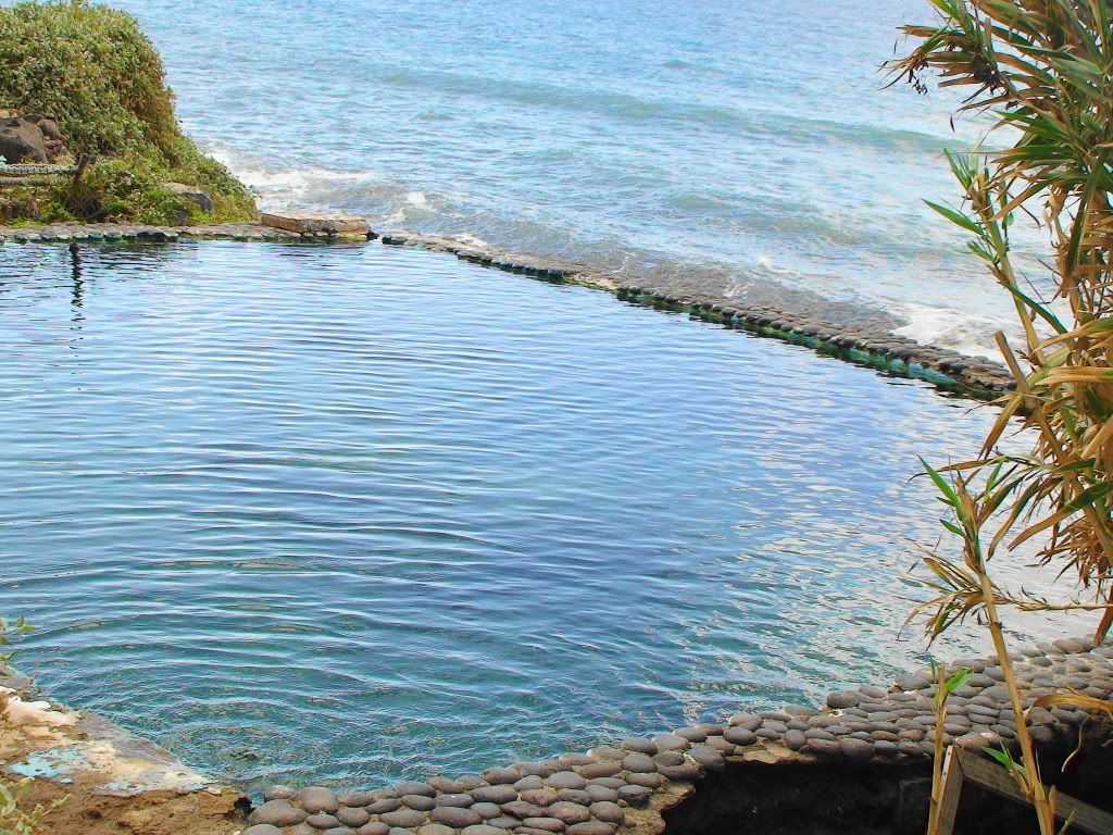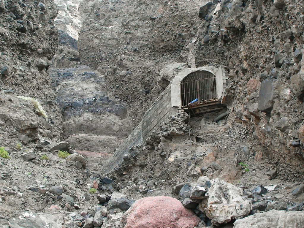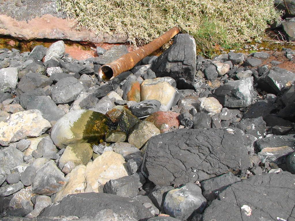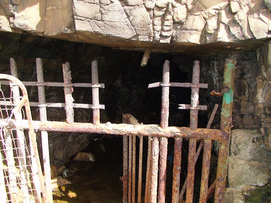 Поднимаемся чуть выше к основному выходу, вода под ногами течёт уже довольно активно.  Та самая дверь с предупреждающей табличкой, вид из туннеля  А вот и сам туннель с длинным каналом-стоком и небольшим резервуаром. Скорость вытекания была приблизительно один стакан за 5 секунд. Вода пресная со слабым минеральным привкусом. Кадры сделаны у самого выхода туннеля на поверхность, глубже я пойти не рискнул, хотя фонарь с собой предусмотрительно захватил.  Уже возвращаясь назад, наверху в скалах заметили ещё один туннель (или ответвление от первого). Хорошо видно, что происходит разрушение и часть нижней подпорки выхода отвалилась.  Забыл упомянуть, что перед верёвочным спуском к пляжу находится заброшенный дом с бассейном прямо на берегу океана, который по-прежнему наполняется водой, вытекающей из туннельных стоков посредством старого трубопровода.