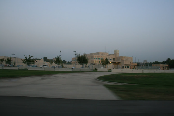 Но в основном приходилось выполнять спецзадание: следить за всякими хмырями, висеть на хвосте в том числе и во всяких кабаках, и шпионить против америкосов. Это Пентагон. Самое большое посольство США в Средней Азии, на окраине Ташкента. Вокруг стены, полиция, и бетонные блоки. Фотографировать запрещено. Высота главного здания - этажей 5 в высоту, и черт его знает сколько под землей: предположительно минус-этажи: -1 мини-аквапарк "Гавайские Острова" -2 гипермаркет ашан, икеа, мега, оби, леруа, и т.д. -3 типографии, почта, телеграф, интернет -4 военный госпиталь -5 военная база со складом оружия и боеприпасов -6 военный аэродром -7 заводы -8 тюрьма -9 военное кладбище   Типа фотографировать пришлось на ходу из Дэу Матиса. Потом в заднем крыле нашли три дырки 12.7мм Не иначе как из барретта хотели нас загасить