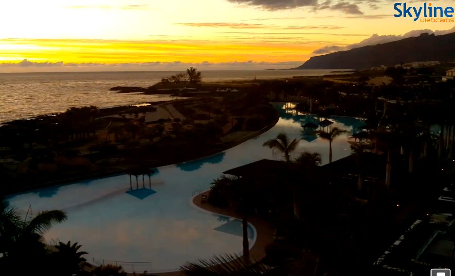 Девятый день. 14 июня. Пляж в Кальяо Сальвахе.Воскресенье. Тучи и холодный ветер. У всех какая-то расслабленность и состояние валяния в постели.  Наверное, требуется передышка после таких насыщенных событиями дней. Поэтому никуда не поехали. Ближе к обеду выбрались в соседний Hiper Dino за продуктами, а где-то после 4-х, когда над океаном стало выглядывать солнышко, а тучи сконцентрировались над горами, решили пойти на местный пляж. Сказано-сделано! На фото и даже сверху от отеля Atlantic Holiday пляж выглядит вполне прилично. Сама по себе природная бухта красивая, особенно скалы. Из ресторанчика, расположенного чуть выше пляжа, открывается неплохой вид на океан. Но вот когда мы спустились по лестнице на пляж, испытали, мягко говоря, разочарование.  Это был единственный случай за весь период отдыха, когда нам что-то не понравилось. Пляж песчаный, с большим количеством темных камешков - что-то вроде мелкой-премелкой щебенки с ОЧЕНЬ острыми краями. На фото выглядит, как мелкий галечник, но увы, это не так... Босиком наступать неприятно. Много камней на берегу да и в самой воде тоже. Но главное - мусор, плавающий в воде и частично валяющийся у кромки. Больше всего его справа у искусственного мола. Лежаков предостаточно (по 4 евро), но занято было всего два. Несколько человек расположились ближе к воде на подстилках и на камнях слева. Мы немного позагорали стоя, в воду зайти желания не возникло. Потому решили не тратить время попусту и пошли в проверенный бассейн в Atlantic Holiday. А вскоре выглянуло солнце. Ветер поменялся на южный и - жизнь наладилась!  Правда, Гомеру опять закрыла легкая дымка... В разговоре с отдыхающими в бассейне выяснили, что в Лоро Парке закрыто шоу косаток. Но вечером старший внук зашел на сайт Лоро Парка, чтобы выяснить причину, а там объявление о том, что с 21-го июня шоу снова в программе! Ура!!!  Вот, значит, 21-го июня и поедем туда!