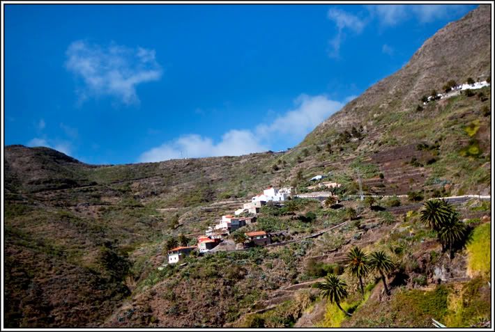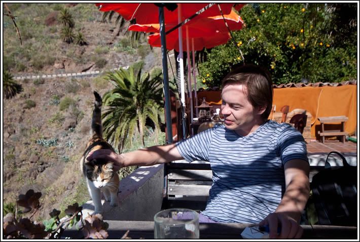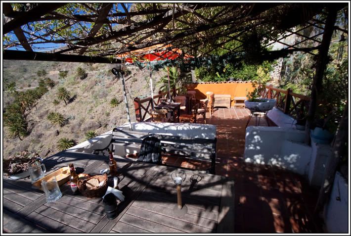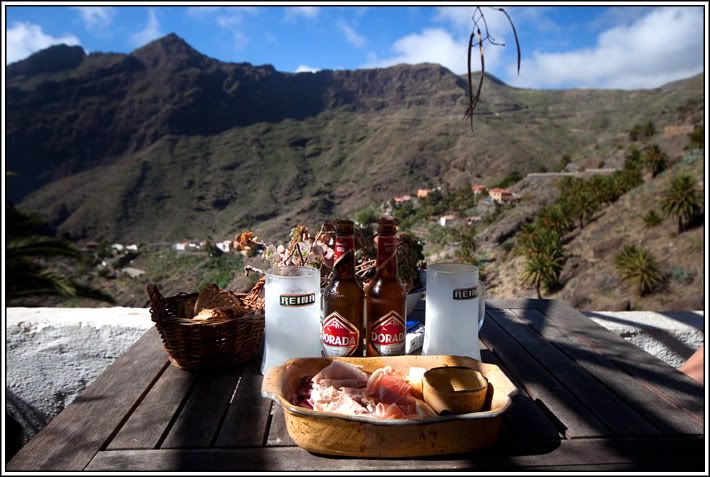 Маска. Рискну признаться, что спуск по ущелью мне совсем не понравился. И дело не в трудности маршрута - если идти только вниз, то он и не трудный. Просто было откровенно скучно.. "Не мои", наверное, пейзажи. Возможно, весной, когда все цветет, там симпатичнее. Надоело уже где-то в середине, мы надеялись, что вот-вот увидим море - а его все не было, зато тропа стала хуже и мы догнали тур. группы.. Возможно, если бы мы вышли раньше них, то впечатления были бы лучше. С лодкой в Гигантес тоже как-то по-дурацки получилось. Мы купили билеты, на которых было четыре названия корабликов, принадлежащих этой компании. В обещанные 16.30 не было никого.  Потом пришел один из указанных, но на него погрузили одну из групп, и он отчалил. Честно говоря, хотелось взять его на абордаж("пиратская" история Маски ассоциации навеяла  ). Потому что не было уверенности, что кто-то еще за нами приедет - расслабленные испанцы не славятся своей обязательностью.  А примерно за полгода до этого мы имели опыт ночного передвижения по горам и он нам совсем не понравился.  Возможно, если бы при продаже билетов нам объяснили, что вот этот кораблик сегодня забронирован для группы, а за нами придет другой(обязательно придет, просто попозже, чтобы дождаться опаздывающих!), то тогда мы бы с бОльшей теплотой вспоминали это приключение...  Гораздо приятнее были два следующих визита в Маску, когда мы просто ездили туда.. завтракать. На самом деле, хотелось просто выпить кофе с видом на ущелье по дороге на север. Но обнаружился очень приятный ресторанчик.. Найти просто - его реклама стоит у первого поворота в самой деревне(координаты поворота: 28.303620, -16.836717). Надо чуть-чуть спуститься вниз, метров 50 буквально, и увидите справа террасу, а впереди - домик со стойкой.  Нам навстречу вышел хозяин и сказал: "Извините, у меня сейчас только завтрак. Но есть холодное пиво!" Против такого неожиданного и милого предложения мы устоять не смогли. "Почему бы двум благородным донам не позавтракать ещё раз?" Терраса Вид Завтрак Хватило на троих В следующий приезд место для парковки нашлось только в конце деревни, и наши ленивые спутники сказали: "зачем идти, вот вполне приятное местечко". Еда не запомнилась, но тоже было очень мило.